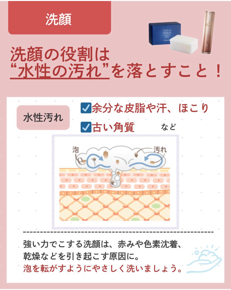 洗顔は、汗や古い角質、ほこりといった「水性の汚れ」をやさしく洗い流すこと。